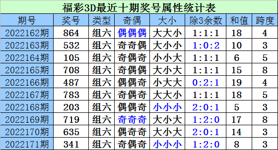 172期财福彩3D预测奖号:奇偶比@大小比