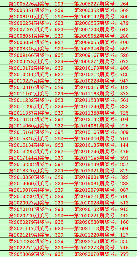 排列三第2023069期开出奖号932,该号码历史上组选出现40次,前39次开出之后期下期奖号为:264、562、300、479、643、280、400、559、526、072、406、785、947、182、378、561、833、725、104、225、389、701、144、479、591、837、829、322、288、087、796、513、913、442、160、694、127、335、746,详见下表: