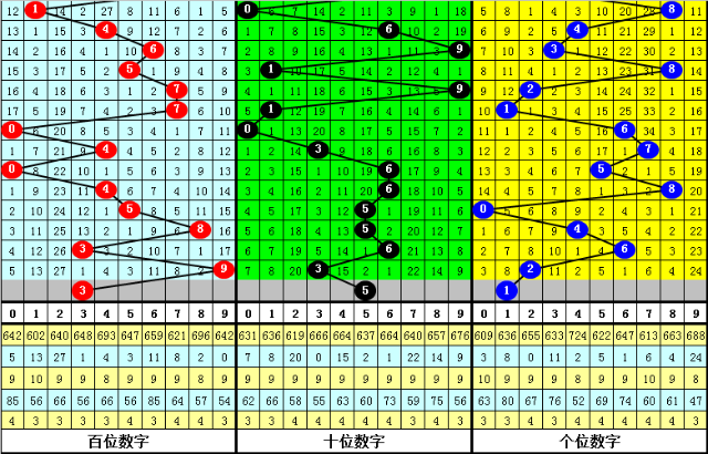 其中,百位奇偶比为3:2,大小比为2:3,本期百位一码参考3。