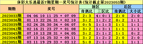 体彩大乐透上周星期一(第2023051期)奖号为03 11 19 29 33 + 03 12,其中前区奖号奇偶比为5:0,三区比为2:1:2,后区奖号奇偶比为1:1,大小比为1:1。
