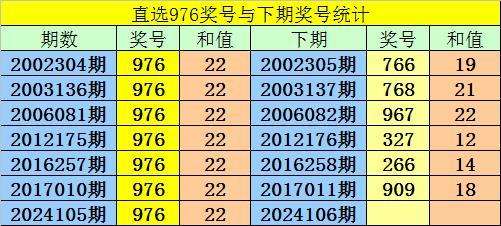 第2024105期3D奖号为:976,历史上该号码直选开出7次,下期号码分别为:766、768、967、327、266、909。