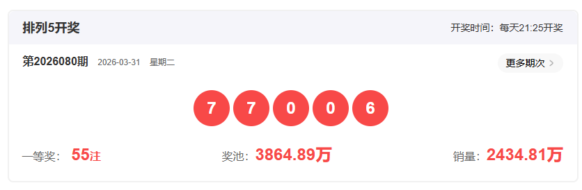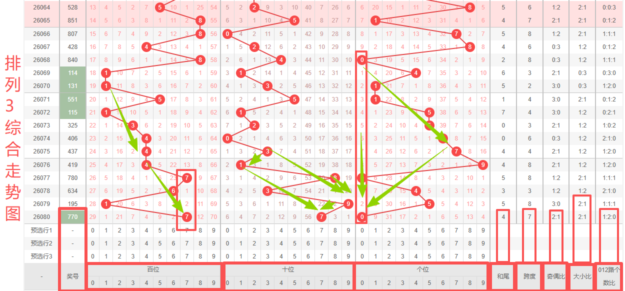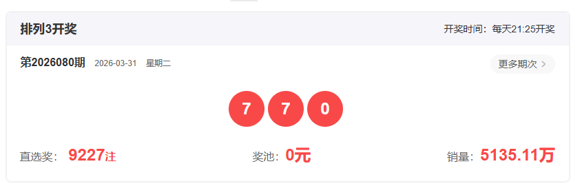 体彩排列3第2026080开奖号码770,形态为组三,奇偶比2:1,和值14,跨度7,大小比2:1,【012】路个数比1:2:0。