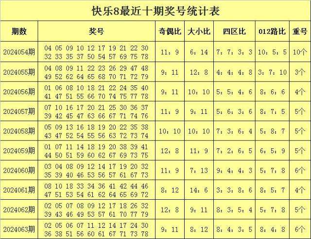 福彩快乐8第2024063期开奖回顾:02 05 06 07 11 12 14 17 24 30 36 38 51 56 60 61 67 71 73 78,其中奖号奇偶比为9:11,大小比为8:12,四区比为8:4:3:5,012路比为8:4:8,重号6个:02、05、07、12、17、61。