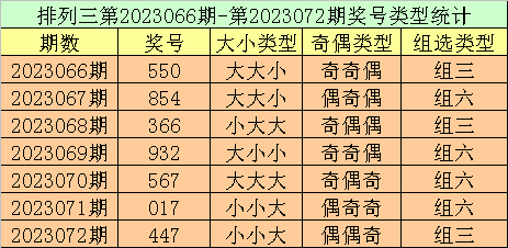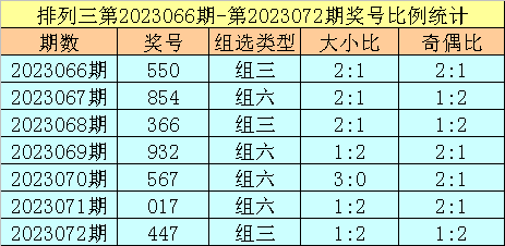 排列三第2023072期回顾:奖号447,奇偶比1:2,大小比1:2,和值15,类型:组三。