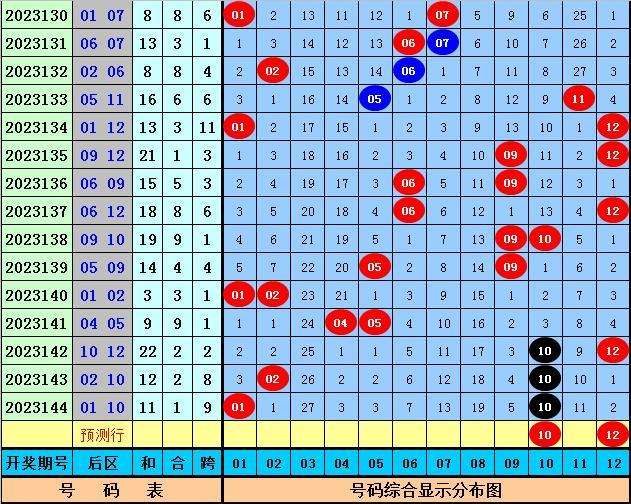后区奖号分析:上期后区开出奖号01+10,奖号和值为11,跨度为9,本期后区注意和值走大,参考两码10 12。