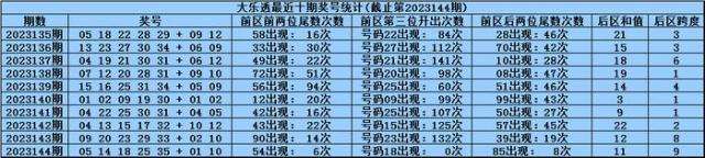 体彩大乐透第2023144期奖号为:05 14 18 25 35+01 10,前区号码大小比开出3:2,012路比开出1:1:3,奇偶比开出3:2,后区号码和值开出11,跨度开出9。