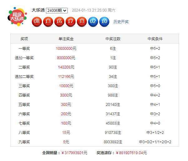 上期开奖:大乐透第2024006期开奖号码为:08、13、16、17、33+02、10。
