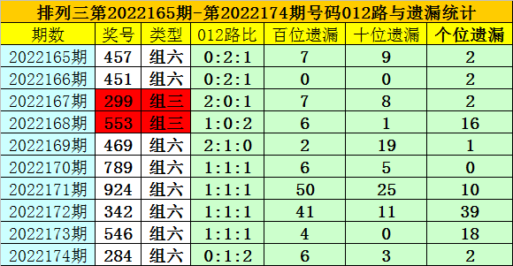 开奖回顾:排列三第2022174期奖号为:284,类型为组六,号码012路比为0:1:2,百十个位号码直选分别遗漏6期、3期和2期。