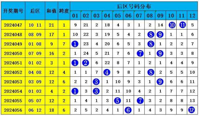 后区上期开出号码06、12,奇偶比为0:2,近十期后区奇偶比为12:8,总体看奇走势较热,本期后区要注意奇偶比1:1,五码复式参考01 06 09 10 11,重点两码推荐:06、11