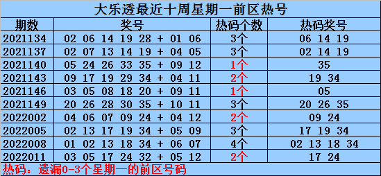 热号:最近十周星期一前区开出24个热号,上周星期一前区开出2个热号,本周星期一注意热号32。