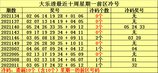 冷号:最近十周星期一前区开出8个冷号,上周星期一冷号出现1个,本周星期一预计冷号强势回归,参考冷号11 15 27。