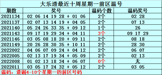 温号:最近十周星期一前区开出18个温号,上周星期一前区开出2个温号,本周星期一关注温号08。