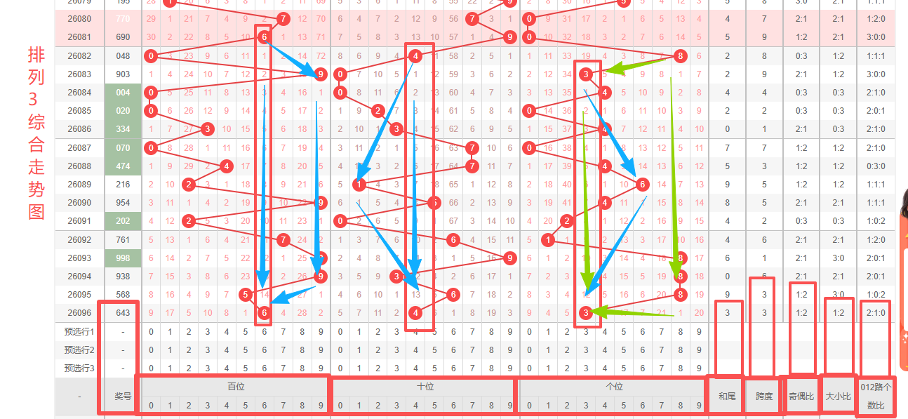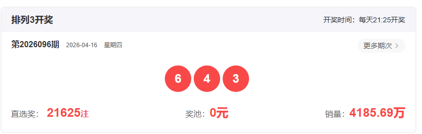 体彩排列3第2026096开奖号码643,形态为组六,奇偶比1:2,和值13,跨度3,大小比1:2,【012】路个数比2:1:0。