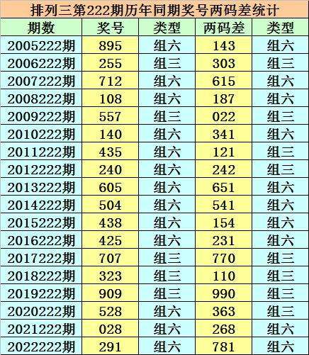 排列三从2004年开奖至今已开出6642期奖号了,其中第222期历史同期奖号出现18次,历年第222期分别开出号码:895、255、712、108、557、140、435、240、605、504、438、425、707、323、909、528、028、291。