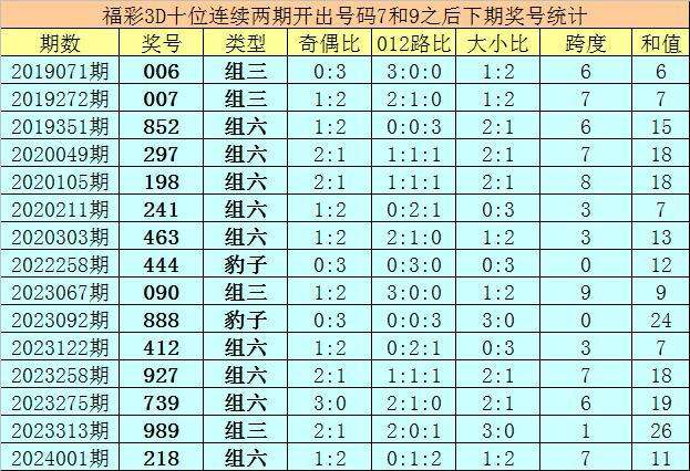 十位号码:前两期十位分别出现奖号7-9,历史上福彩3D连续前后分别开出号码7-9的现象共开出78次。在十位7-9的现象出现时,最近15期其下期分别开出号码:006-007-852-297-198-241-463-444-090-888-412-927-739-989-218;