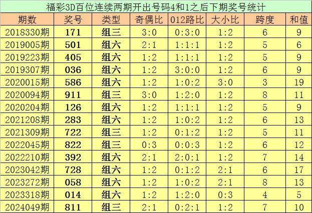 百位号码:连续两期百位出号分别为:4-1,历史上福彩3D连续两期前后分别出号4-1的奖号共出现86次。在百位4-1的奖号现象出现时,近15期下期分别出号:171-501-405-036-586-911-126-283-722-822-392-728-058-014-811;