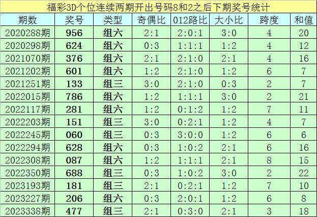 个位号码:最近两期个位开出号码为8-2,在福彩3D历史开奖中,前后两期个位分别开出号码8-2的奖号出现了79次。最近15期个位8-2组合出现之后,其下期奖号分别为:956-624-376-601-133-786-281-151-060-628-087-688-181-206-477;