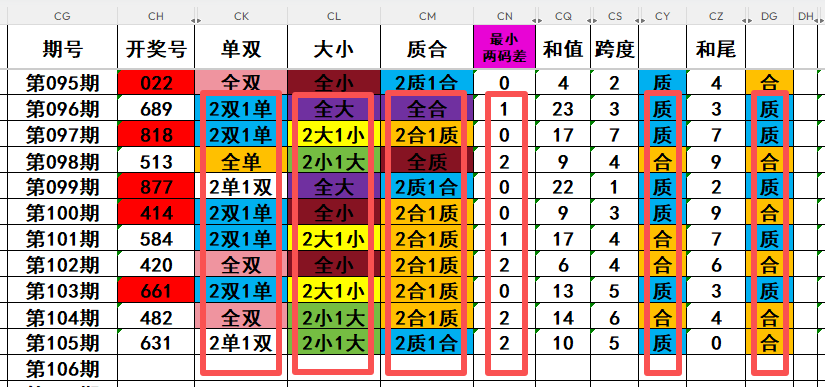 4,最近10天当中,最小两码差0开出4次,最小两码差1开出2次,最小两码差2开出4次,最小两码差3开出0次,