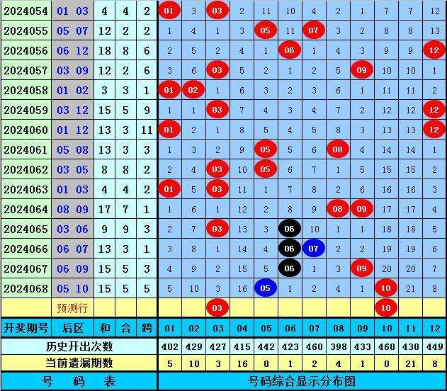 后区分析【一区01-04,二区05-08,三区09-12】:上期后区奖号为05和10,分别落在第二、三区,近50期后区三区比为30:43:27,近10期三区比为6:9:5,本期注意第一、三区号码出现,关注两码03+10。