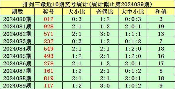 上期回顾:排列三第2024089期奖号为:117。奖号类型:组三,和值:9,奇偶比:3:0,跨度:6,大小比:1:2。