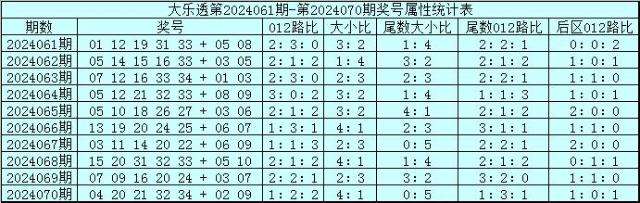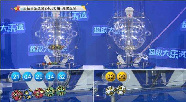 体彩大乐透第24070期奖号为:04 20 21 32 34+02 09,其中前区奖号012路比为1:2:2,大小比为4:1,奇偶比为1:4,包含同尾奖号:04 34。