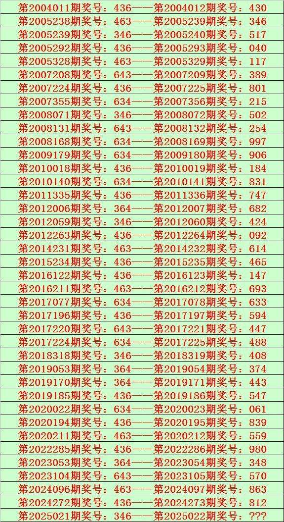 排列三第2025021期开出奖号346,该号码历史上组选出现39次,前38次开出之后期下期奖号为:430、346、517、040、117、389、801、215、502、254、997、906、184、831、747、682、424、092、614、465、147、693、633、594、447、488、408、374、443、547、061、839、559、980、348、570、863、812,详见下表: