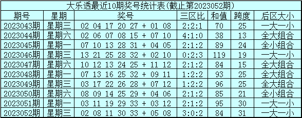 前区三区分析:上期前区奖号三区比为3:0:2。