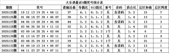 体彩大乐透第2025133期奖号为:04 11 23 27 35 + 07 11,各位号码遗漏期数分别为:5期、7期、20期、2期、3期+0期、2期,前区号码遗漏总期数为37期,012路比为1:1:3,奇偶比为4:1,没有开出重复号码。后区号码遗漏总期数为2期,和值为18,跨度为4。