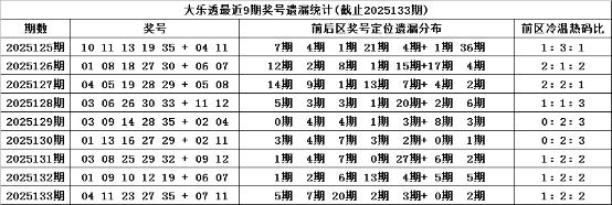 上期前区开出2个热码:27、35,表现相对较冷,近9期热码走势非常活跃,目前前区有17个热码,本期注意热码走势低迷,防在2个以内开出,看好热码:01、13、16、27、32。