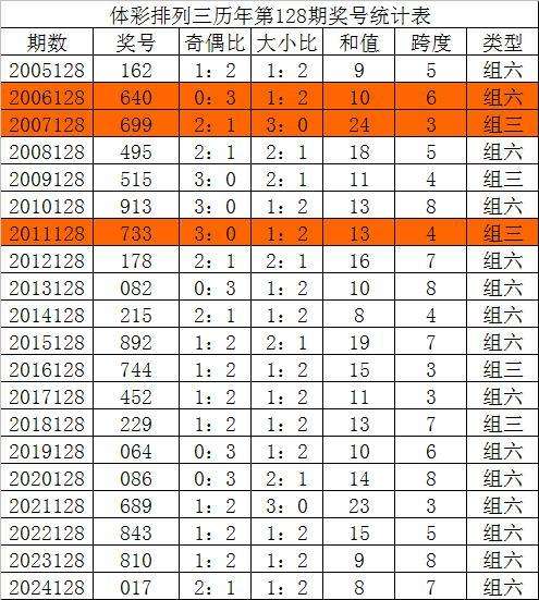 在历年排列三第129期开奖中:组三号码出现9次,组六号码出现10次。组六号码开出比例略低,本期奖号形态看好:组六号码。