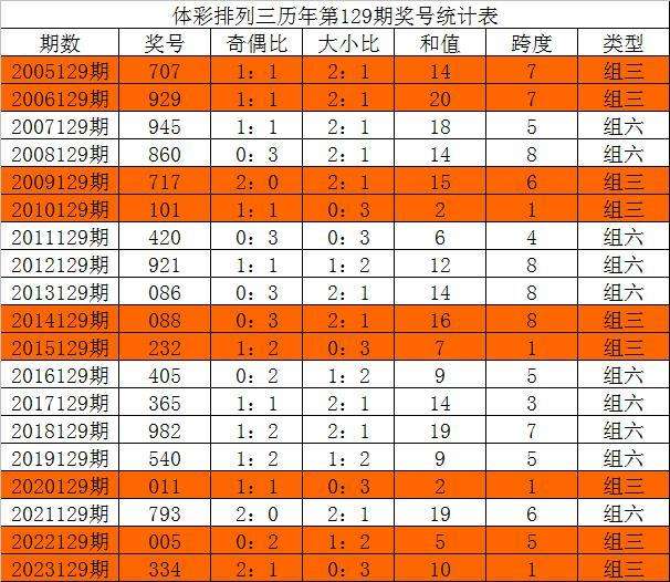 体彩排列三历年第129期开出奖号分别为:707、929、945、860、717、101、420、921、086、088、232、405、365、982、540、011、793、005、334。统计详见下表: