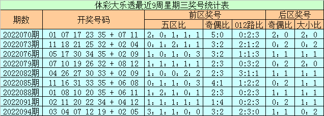 上期回顾:体彩大乐透上周星期三(第2022094期)奖号为03 04 07 12 19 + 02 05,前区奖号五区比为3:1:1:0:0,奇偶比为3:2,012路比为2:3:0,后区奖号奇偶比为1:1,大小比为0:2。