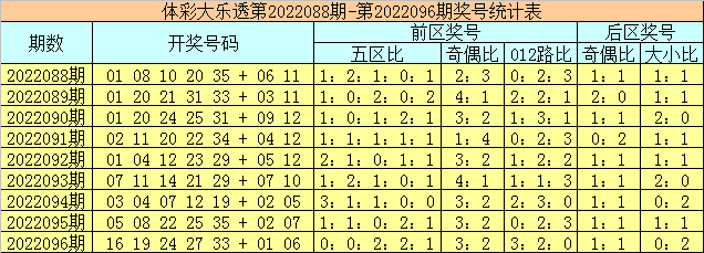 体彩大乐透第2022096期奖号为16 19 24 27 33 + 01 06,前区号码五区比为0:0:2:2:1,奇偶比为3:2,012路比为3:2:0,后区号码奇偶比为1:1,大小比为0:2。