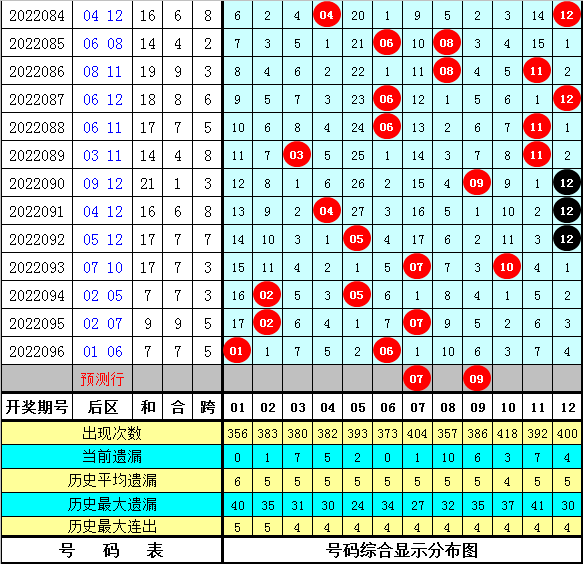 石浩第2022097期大乐透后区分析:后区上周星期三后区奖号为02和05,上期开出奖号01和06,最近9周星期三与最近9期后区奖号奇偶比分别为6:12和9:9,大小比都为9:9,本期后区注意全大组合,参考号码07、09、10、11。