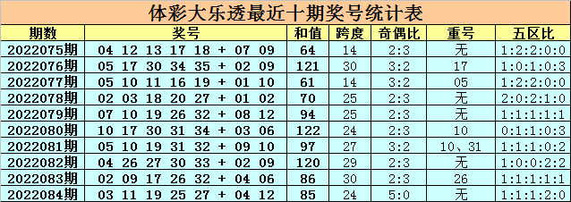 上期开奖:大乐透第2022084期奖号为:03 11 19 25 27 + 04 12,前区号码和值为85,跨度为24,奇偶比为5:0,无重号,五区比为1:1:1:2:0。