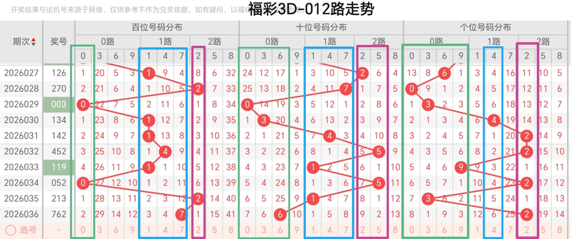 百位0路号码(0、3、6、9)近10期仅开出2次,出号频次显著偏低,处于明显冷态。目前该路号码已间隔2期未出,从走势回补规律来看,冷态过后大概率迎来出号反弹,具备较强的回补预期,可重点关注其本期表现。