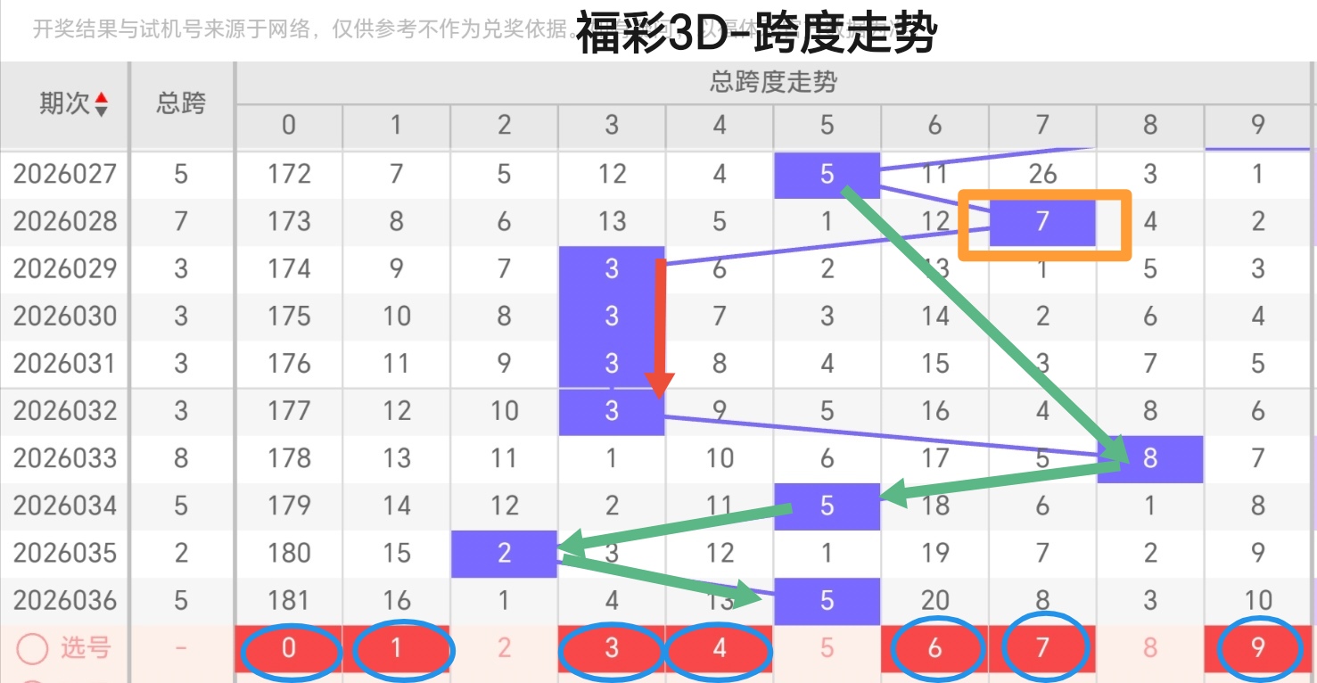 近10期跨度走势中,0路跨度(0、3、6、9)开出4次,1路跨度(1、4、7)开出1次,2路跨度(2、5、8)开出5次。2路跨度虽近期偏热,但已连续四期开出,热度大概率衰减,本期可大胆排除2路跨度,聚焦01路跨度。综上,本期跨度备选:0、3、6、9、1、4、7。