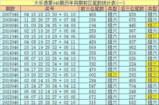 在大乐透第046期历年同期奖号中,前区后三位尾数出号频次分别为:尾数2出现10个,尾数4、5、9出现6个,尾数0、6、7出现5个,尾数8出现4个,尾数3出现3个,尾数1出现1个。其中尾数数字三类型豹子、组三、组六次数比为0:7:10,今年同期后三位尾数类型参考组六;