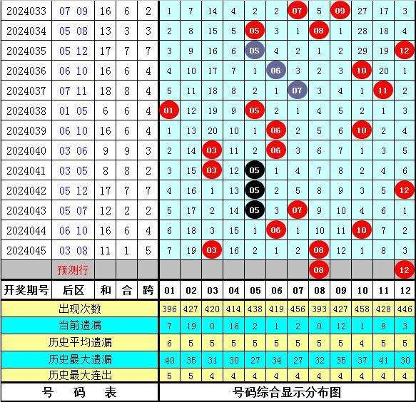 大乐透历年同期第046期后区尾数奇偶比为12:22,最近5年尾数奇偶比为2:8,后区尾数大小比为13:21,最近5年尾数大小比为3:7,本期后区注意号码01、04、08、11、12,后区两码关注08、12。