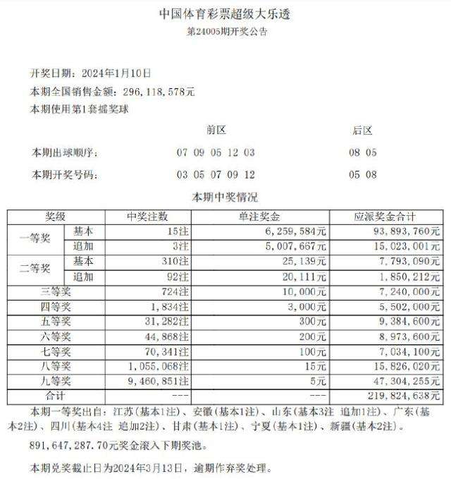 北京时间1月10日晚,体彩大乐透第24005期开奖,当期开奖号码为:前区03 05 07 09 12,后区05 08。本期大乐透全国销量为2。96亿元,计奖结束后奖池余额8。91亿元。