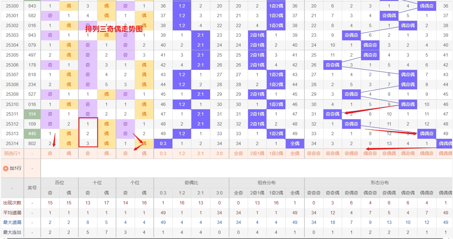 排列三 奇偶分析:从上图可以看出排列三100期内百位奇偶比约为49比51,十位奇偶比为45比55,个位奇偶比为48比52,百位的比值比较均衡,但是十位的比值偏差就有点大,历史奇偶形态近2期开出偶偶偶后下一期的走势为,第237期开出偶偶偶后238期开奇偶奇, 第246期开出偶偶偶后第247期开奇奇奇,第257期开出偶偶偶后第258期开偶偶奇,近期排列三奇偶走势分析,“奇偶奇”组合作为当前的热门形态,其出现频率显著偏高,呈现出较强的势头,短期内仍有持续热出的惯性,需重点防范其连下的可能;与此同时,“奇奇奇”全奇组合作为冷态已连续遗漏34期,达到历史遗漏的临界区间,从概率均衡与冷态回补规律来看,其反弹压力正不断累积,存在较强的回补预期。采取热态延续与冷态回补相结合的防守策略,既要关注“奇偶奇”热号的顺势延伸,也需对“奇奇奇”冷号的触底反弹保持警惕,所以排列三2025315期奇偶形态推奇偶奇与奇奇奇。