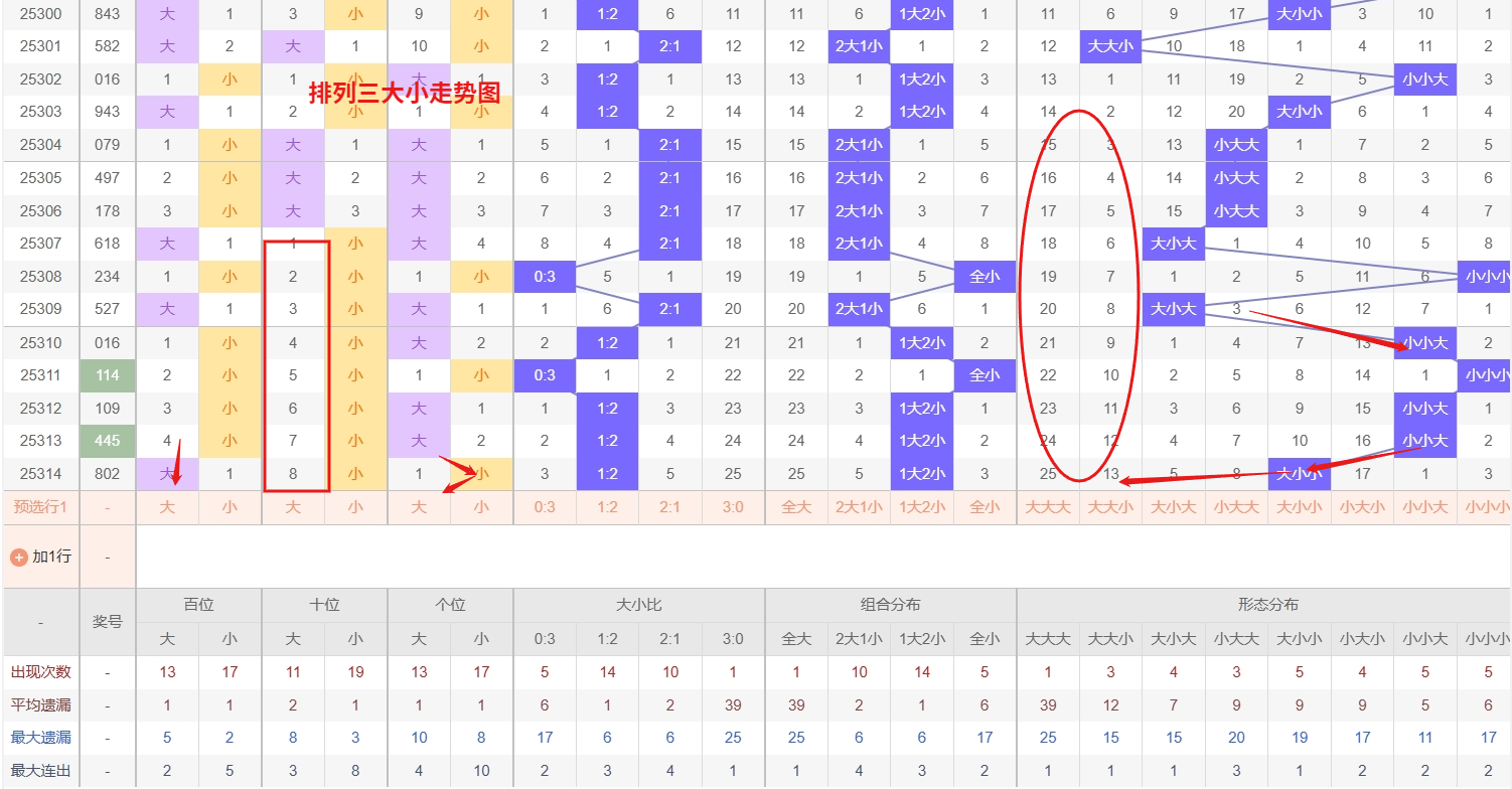 排列三 大小形态分析:从大小走势图上可以看出排列三100期内百位大小比约为45比55,十位大小比约为48:52,个位大小比约为53比47,除了个位奇数比偶数多,十位和百位是偶数比奇数多。历史数据近2期开出大小小下一期的走势为,第247期开出大小小第248期开大大小。第251期开出大小小后第253期开大大大,第264期开出大小小后265期开小大小。近期排列三大小走势分析,“大大小”组合作为温号已呈现出频率逐步上升、间隔持续缩短的态势,其结构稳定性有所增强,显示出明确的转热迹象,短期内需密切关注其热态成型并持续开出的可能;与此同时,“大大大”全大组合作为长期未现的冷号,其历史遗漏值已累积至关键区间,从概率回补与形态平衡的角度看,冷极必反的反弹动能正在不断增强,须重点防范其突然解冻回补。采取温号追热与冷号防守相结合的策略,既要把握“大大小”由温转热的趋势机会,也要对“大大大”冷号的强势回归预留防守空间,所以排列三第2025315期大小形态推荐大大小防大大大。