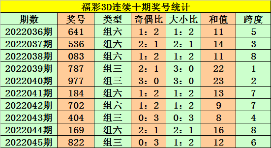 2。福彩3D第2021046期-第2022045期组三出现(其中包含2期豹子号)91出现概率为26%;半顺出现153期,其中包含21期全顺,出现概率为44%;杂六出现107期,出现概率为31%。