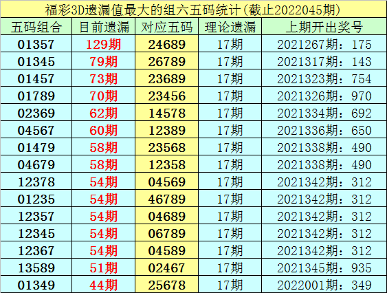 1。截止第22045期,五码组六遗漏最大的是:01357,当前遗漏129期。