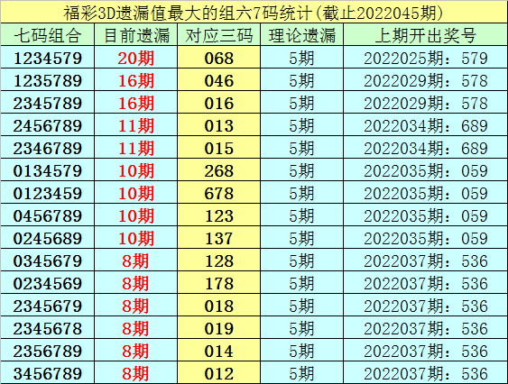1。截止第22045期,七码组六遗漏最大的是:1234579,当前遗漏20期。