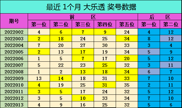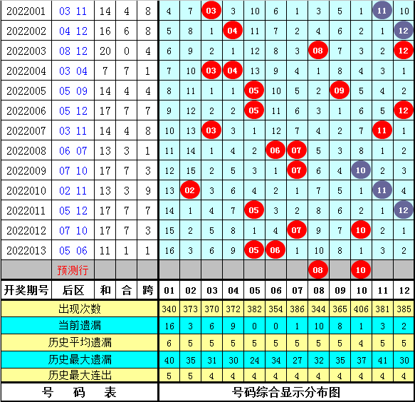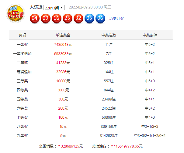 上期开奖:大乐透第2022013期开奖号码:04 09 16 25 32+05 06。其中前区号码012路比为1:3:1,奇偶比为2:3,大小比2:3。后区和值为11,跨度为1。