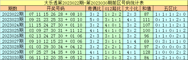 4、前区五区分析:最近9期前区五区比为7:10:5:12:11,上期奖号五区比为1:2:1:0:1,第二区大热,第四区断区,本期预计第四、五区号码大热,防第二、三区号码全部轮空,参考五区比1:0:0:2:2。