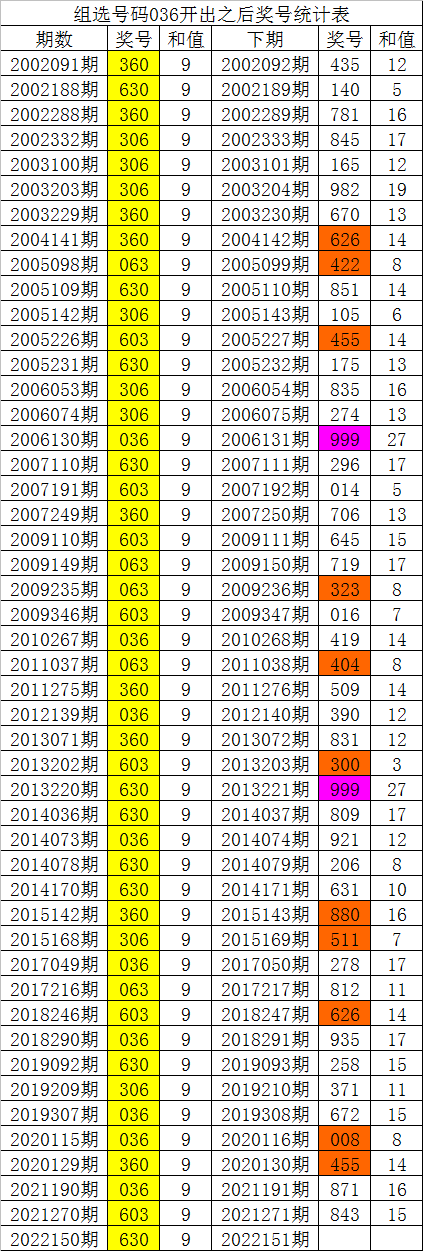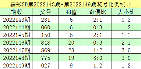 一、上期回顾:福利彩票3D第2022150期开奖结果:奖号为630,奖号和值为:9,奖号跨度为:6。