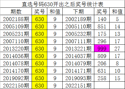 福彩3D第2022150期开出直选号码为:630,该直选号码历史上出现了10次,其下期分别开出了号码:140、851、175、296、999、809、206、631、258,如图: