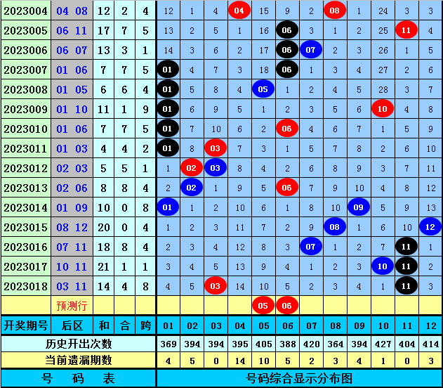 后区分析(定义:01-04为一区,05-08为二区,09-12为三区):上期后区开出奖号03和11,分别出现在第一区和第三区和区,,最近10期后区三个区间落号个数比为9:4:7,本期后区注意第一区和第二区号码出现,关注两码05、06。